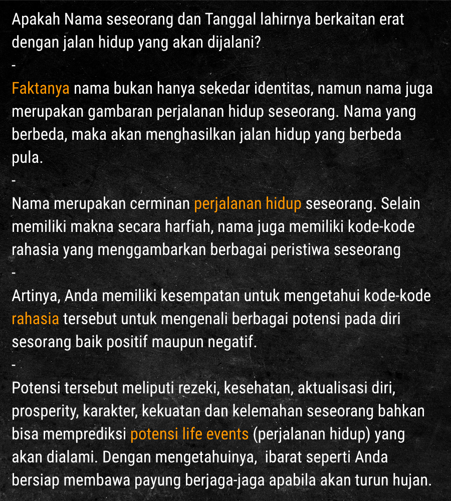 Susunan nama yang harmonis menyimpan kekuatan luar biasa bagi pemiliknya. Sejak dulu, orang sudah mengenal pentingnya memberi nama terbaik pada anak-anak mereka. Sebab nama tidak sekedar jadi identitas pengenal. Di dalamnya ada unsur doa, harapan, serta keinginan positif. Dan itu yang meresap ke dalam bawah sadar manusia. Begitupun sebaliknya, nama yang tidak harmonis dengan unsur tanggal lahirnya juga berdampak pada kehidupan. Sudah bukan menjadi rahasia lagi bahwa banyak sekali contoh orang – orang yang sebelumnya sakit-sakitan, sering sial dan lain sebagainya akhirnya memutuskan untuk mengganti nama agar harmonis dengan tanggal lahirnya tersebut dengan harapan terjadi perubahan positif di kehidupannya.
