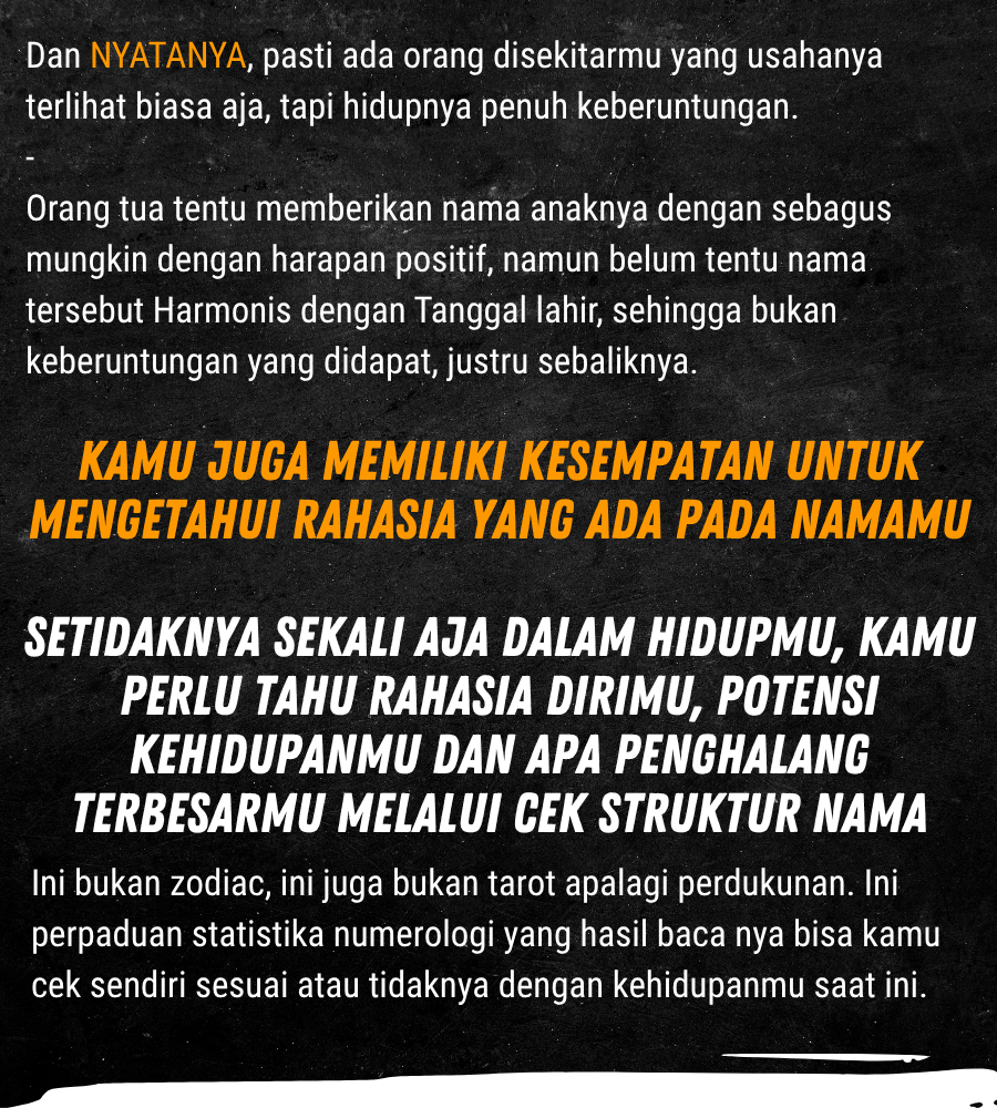 - Perbaikan nama TIDAK mengganti atau mengurangi nama Lengkap Anda, kami menambahkan SATU KATA pada nama Anda sebagai penyeimbang sesuai dengan metode kami. Anda TIDAK PERLU mengganti legalitas seperti KTP, IJAZAH dll, Nanti mendapatkan petunjuk untuk penerapannya.