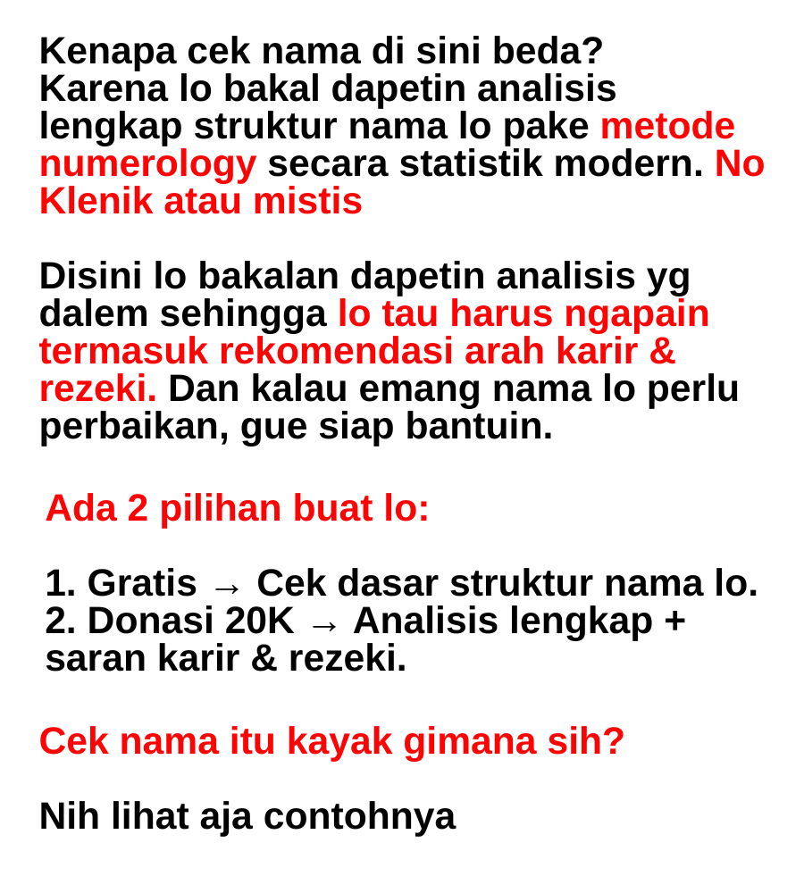 2. Pengecekan Nama Versi Lengkap Termasuk Saran Karir PLUS Bonus Baca Garis Tangan (Palmistry) dikenakan donasi Rp. 20.000,-